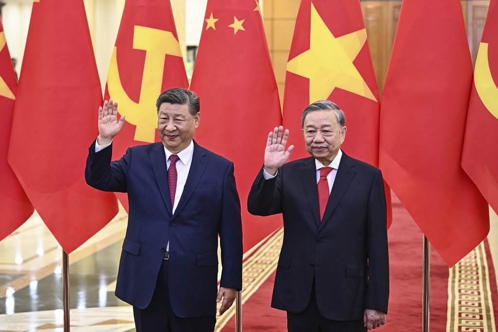 美中關稅戰升溫之際,中國領導人習近平和越共中央總書記蘇林同框展現好交情。(圖/美聯社)