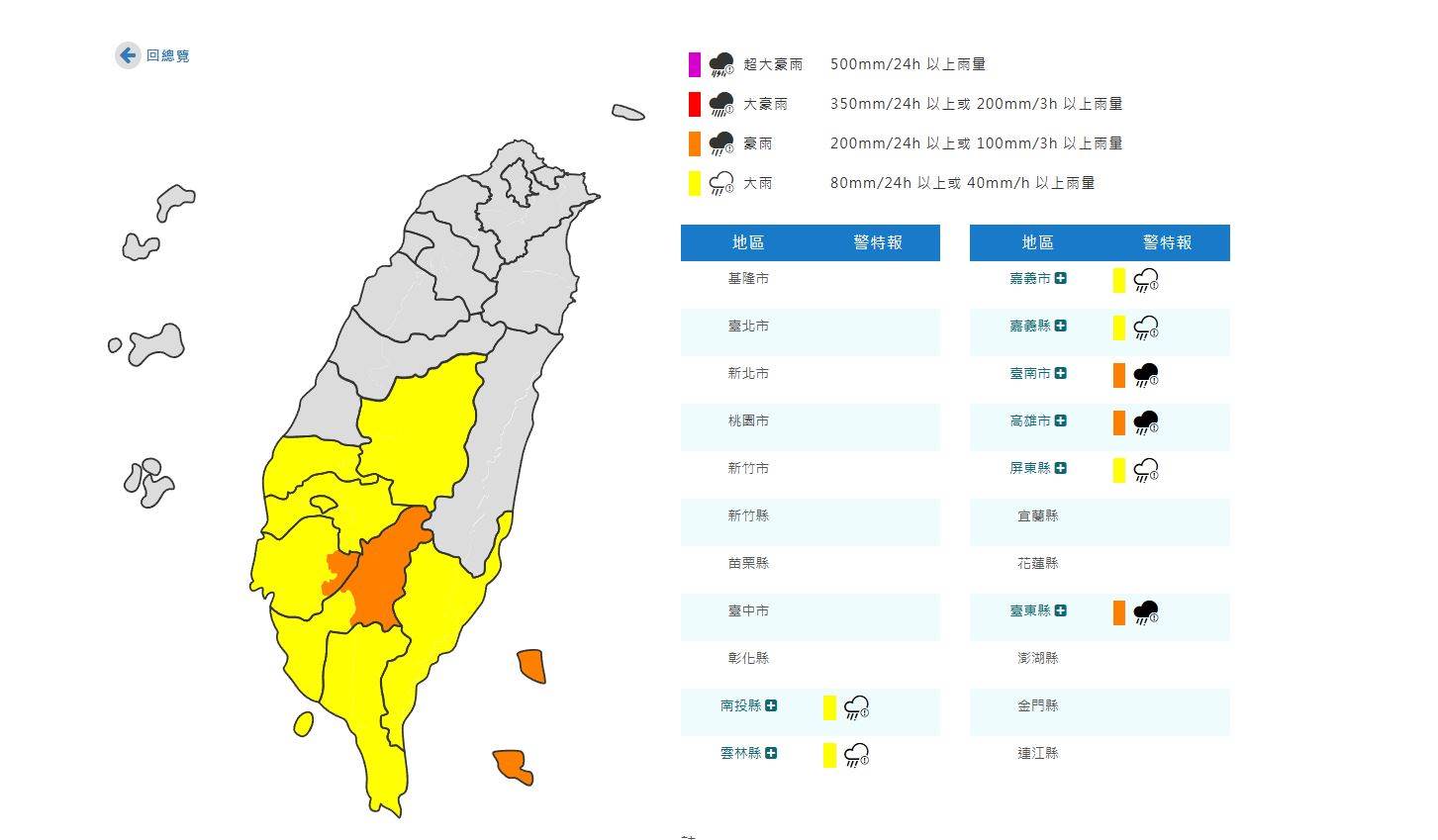 中央氣象署表示,臺南市、高雄市山區及蘭嶼有局部大雨或豪雨,南投、雲林以南及臺東地區(含綠島)有局部大雨發生的機率,請注意雷擊及強陣風,山區請慎防坍方及落石,低窪地區請慎防積水。