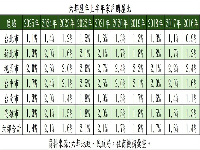 央行去年9月推出信用管制措施,令上半年房市買氣重回十年前。住商機構彙整六都資料,統計六都2025年上半年家戶購屋比。資料顯示,以往有廣大購屋買盤的六大都會區,上半年家戶購屋比僅1.4%,象徵每百戶中僅有1.4戶買房,平2016年以來最低紀錄。大家房屋企劃研究室公關主任賴志昶分析,此波政府打房之外,又有限貸風波延續,令自住與置產買盤皆冷靜不少。