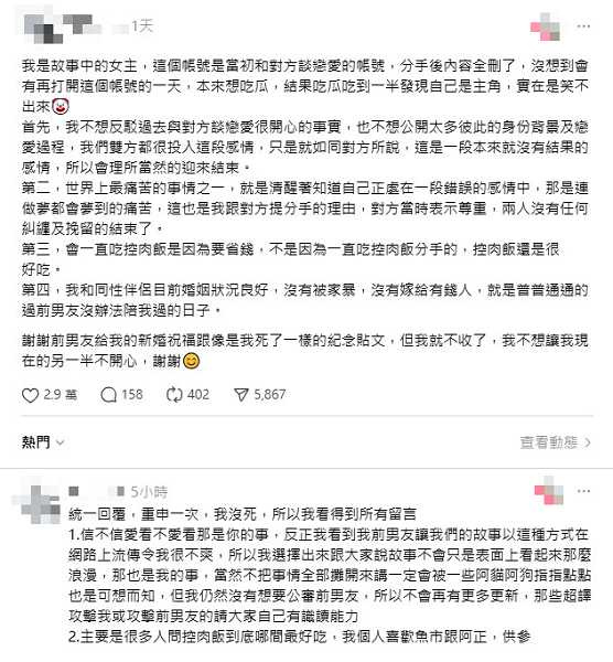 女網友補充,「我沒死,所以我看得到所有留言」,她看到前男友讓他們的故事以這種方式在網路流傳,感到很不開心,所以選擇說清楚,「故事不會只是表面上看起來那麼浪漫,那也是我的事,當然不把事情全部攤開來講」。
