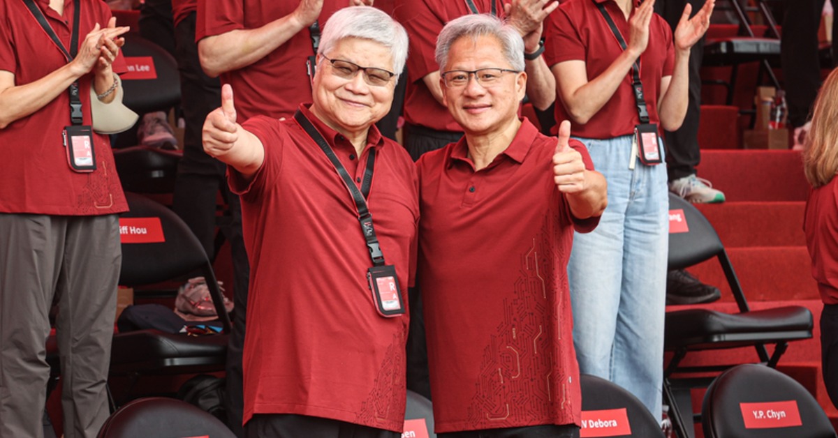 輝達(NVIDIA)執行長黃仁勳(右)與台積電董事長魏哲家(左)8日一同在新竹縣立體育場出席台積電年度運動會。(圖/中央社)