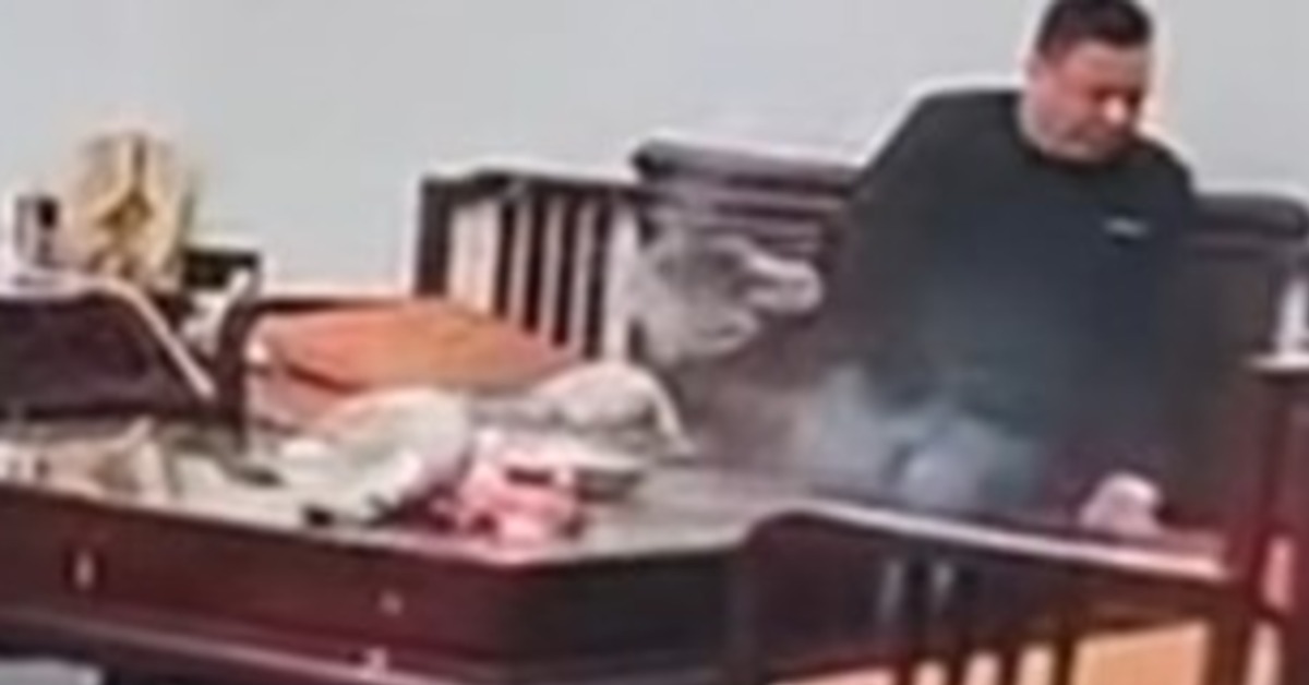 一名男子將罐裝瓦斯放在泡茶桌上,結果泡茶倒熱水時不小心淋倒瓦斯罐,導致罐子瞬間爆炸冒出白煙。(圖/翻攝自@ 星视频 抖音)