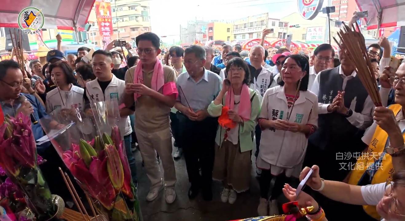 柯文哲夫婦與黃國昌等民眾黨員向媽祖祈福。(圖/白沙屯拱天宮提供)