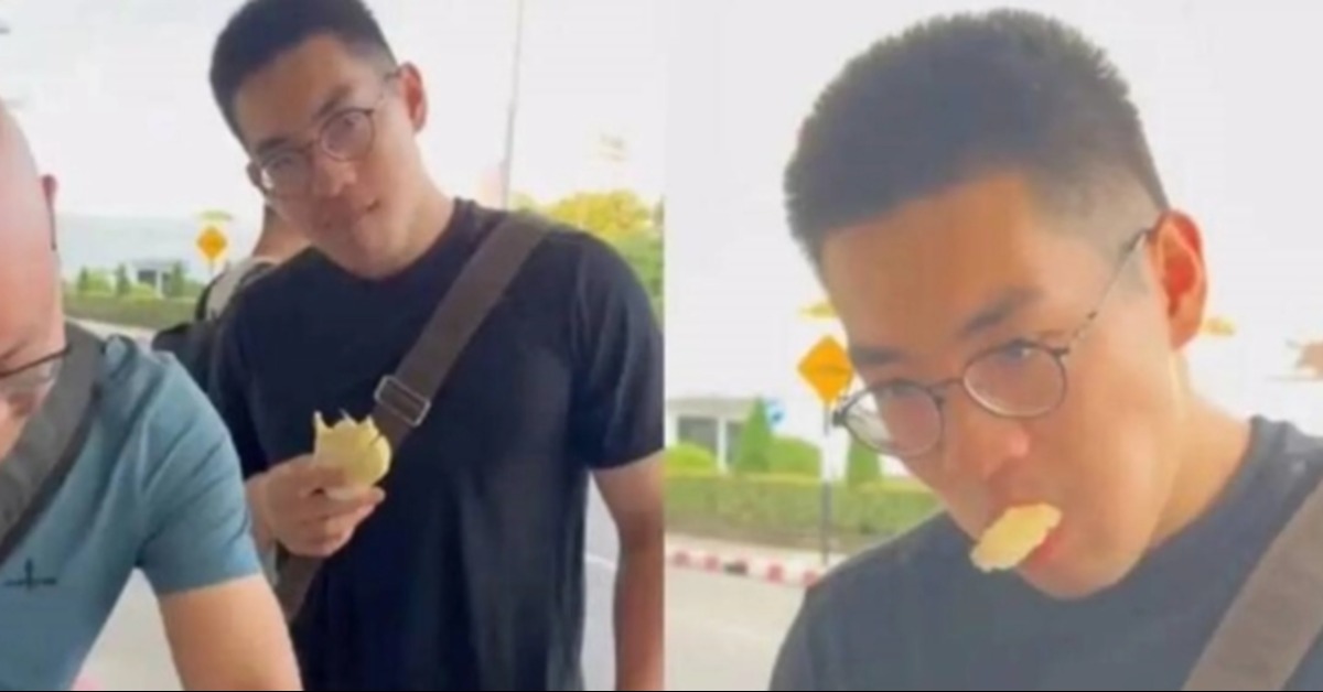 泰國清邁機場日前出現一幕荒謬畫面,中國一個家庭竟為了不浪費水果,選擇在機場外硬吞5.5公斤榴槤,畫面被網友拍下後瘋傳,短短幾天就吸引超過18萬人按讚。