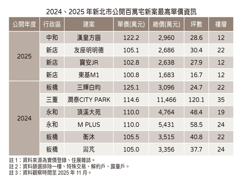 住展雜誌統計,新北市在2023年於板橋區出現單價三位數新案後,後續逐步見到百萬宅生力軍,住展雜誌彙整近兩年公開新案並有交易攀上單坪百萬元資訊,去年共計6案,分別為板橋區3案「三輝白昀」、「衡沐」、「耑芃」,與永和區2案「M PLUS」、「頂溪大苑」,以及三重區「潤泰CITY PARK」,最高單價在1